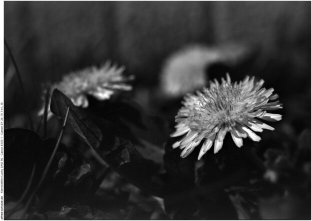 Eine neue Kamera (Canon EOS 1 N) und ein neuer Film (Lucky SDH 50) schrien nach einem Test. Also die gestrigen Wolkenlücken abgepasst und raus, Makros und Landschaftsaufnahmen machen.